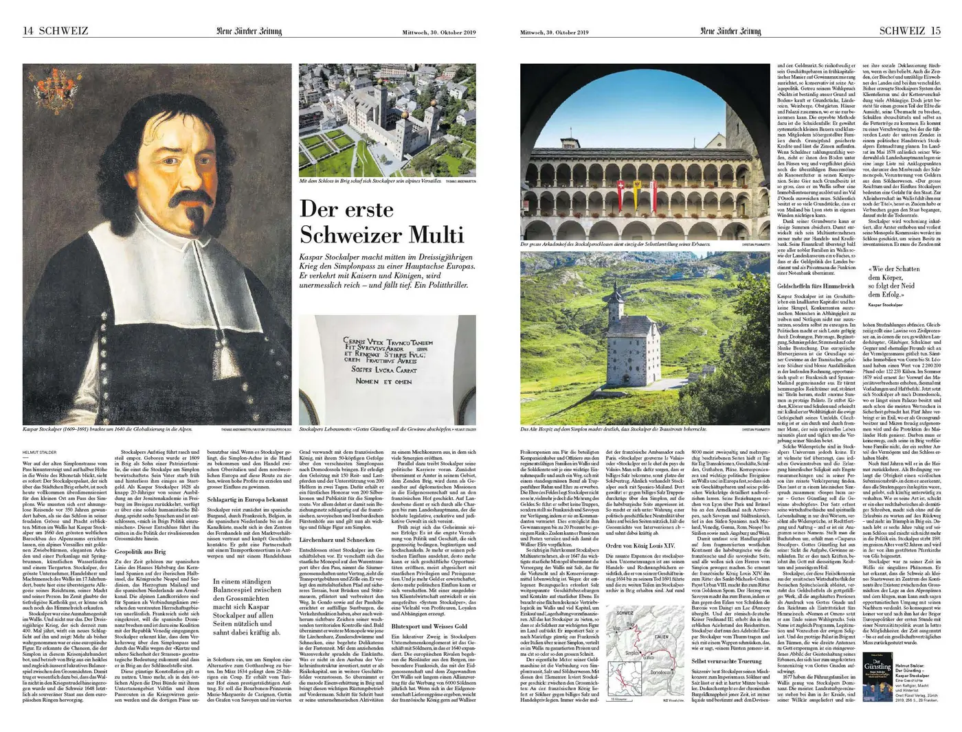 Helmut Stalder, Inlandredaktor und Stiftungsrat der Schweizerischen Stiftung für das Stockalperschloss, schreibt in der NZZ vom 30. Oktober 2019 über den ersten Schweizer Multi, der den Simplonpass inmitten des Dreissigjährigen Kriegs zu einer Hauptachse des europäischen Kontinents machte. Der Artikel bietet einen lesenswerten Einblick in das neueste Werk des Autors zur Vita des grossen Stockalper: