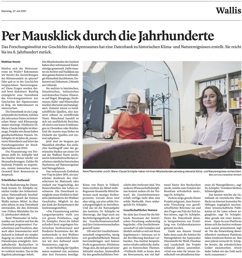 Wir danken dem Walliser Boten für seinen Besuch im Forschungsinstitut zur Geschichte des Alpenraums, anlässlich dessen wir unsere reich befrachtete, im Rahmen mehrer Forschungsprojekte erarbeitete Datenbank zu den historischen Klimadaten und Naturgefahren im Wallis präsentieren durften. Das Endprodukt der langjährigen Erhebungsarbeiten ist eine auf EDV-Ebene fortlaufend weiterentwickelte, verschiedenste Suchfunktionen anbietende, auf dem Gebiet der Schweiz einzigartige Klima- und Naturgefahrendatenbank, die nach derzeitigem Stand 9336 Datensätze (einzeilige bis mehrseitige Einträge) umfasst, welche nach 149 Stichworten kategorisiert 12’556 Einzeleinträgen entsprechen. Die erhobenen Daten stammen aus lateinischen, deutschen, italienischen und französischen Texten für den Zeitraum vom 6. bis zum 21. Jahrhundert.