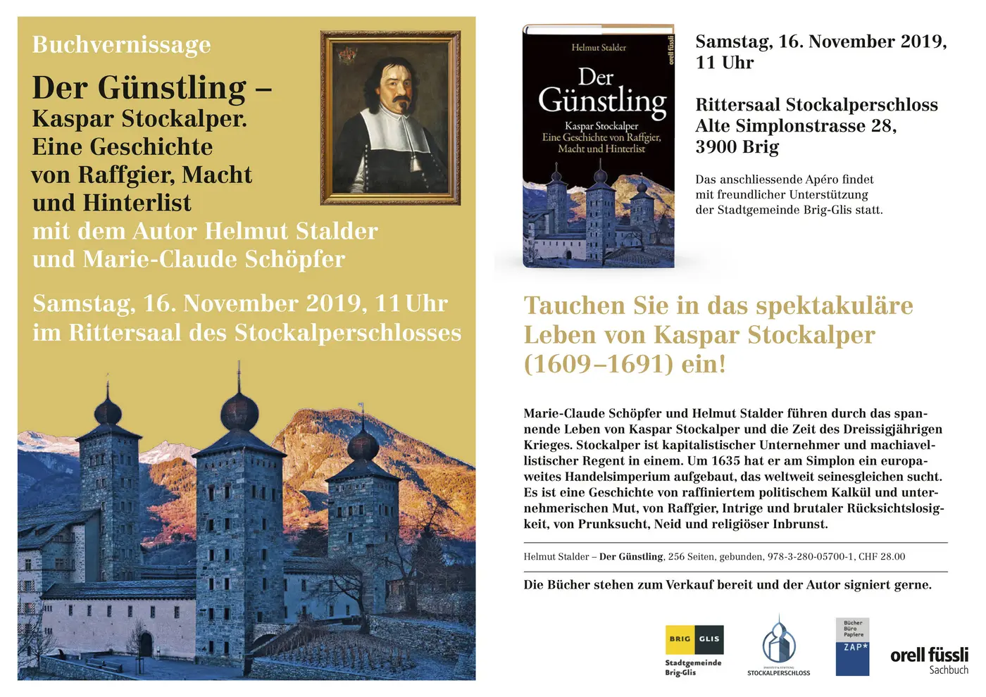 Nehmen Sie an der Vernissage zum Buch von Helmut Stalder teil und tauchen Sie ein in das spannende Leben von Kaspar Stockalper vom Thurm (1609–1691) und die Zeit des Dreissigjährigen Krieges. Stockalper ist kapitalistischer Unternehmer und machiavellistischer Regent in einem. Der Autor und die Schweizerische Stiftung für das Stockalperschloss freuen sich, Sie zur Präsentation der neuesten Publikation über den grossen Briger im Rittersaal willkommen zu heissen!