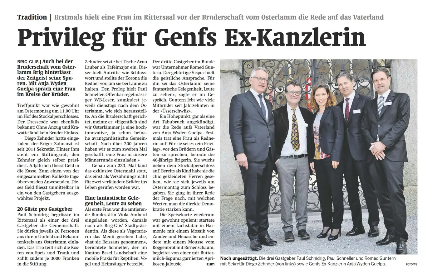 Anja Wyden Guelpa, Präsidentin der Schweizerischen Stiftung für das Stockalperschloss, hielt am 233. Mahl der Bruderschaft vom Osterlamm am Ostermontag 2019 im Rittersaal des Stockalperschlosses in Brig die «Rede auf das Vaterland». Damit trat erstmals eine Frau als Rednerin vor den Kreis der Brüder. In Ihrer Rede griff sie die Thematik auf, wie die Werte der Demokratie gestärkt werden können.